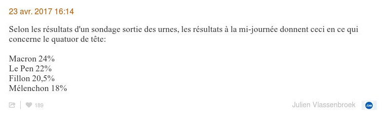 «Οπως το περιμέναμε: ο βελγικός Τύπος δημοσιεύει exit polls. Αλλά επειδή αυτές οι μετρήσεις δεν έχουν πηγή και η Liberation δεν μπορεί να εγγυηθεί την εγκυρότητά τους, σας συνιστούμε να τα λάβετε υπόψιν με μεγάλη προσοχή. Σας υπενθυμίζουμε ότι οι μεγάλες εταιρείες δημοσκοπήσεων (BVA, Elabe, Harris Interactive, Ifop, Ipsos, Kantar, Odoxa, OpinionWay, Viavoice) δεσμεύτηκαν ότι δεν θα πραγματοποιήσουν exit polls την Κυριακή 23 Απριλίου.