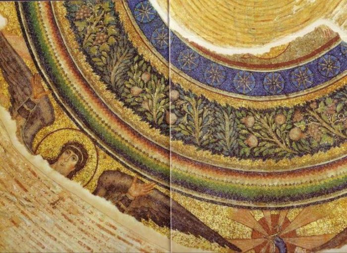 Τον Ιερό Ναό των Ασωμάτων Αγγέλων, κοσμούν λαμπρά ψηφιδωτά και μοναδικές στον κόσμο αγιογραφίες, ενώ συνάμα χαρακτηρίζεται και ως «θαύμα» ακουστικής! Στο θόλο αναπτύσσονται μεγάλες συνθέσεις ιεραρχημένες σε τρεις ζώνες με θέμα, την θριαμβική εμφάνιση του Χριστού ως Ουράνιου Βασιλέα. Στη μεσαία ζώνη, που έχει σχεδόν ολοκληρωτικά καταστραφεί, υπήρχαν μορφές αποστόλων από τις οποίες σώζονται μόνο τα πόδια. Από την ανώτερη ζώνη σώζονται τα κεφάλια τριών εκ των τεσσάρων αγγέλων που στηρίζουν δόξα από αστέρια και στεφάνι με φύλα και καρπούς. Μεταξύ των αγγέλων εικονίζεται το μυθικό πτηνό φοίνικας να προβάλλει πάνω σε ερυθρό ακτινοβόλο δίσκο. Το σύνθετο νόημα του διακόσμου ολοκληρώνεται στο κέντρο της δόξας, όπου διατηρούνται ίχνη από το αρχικό σχέδιο του ολόσωμου Χριστού σε στάση θριάμβου, σχεδιασμένο με κάρβουνο πάνω στις πλίνθους του θόλου.