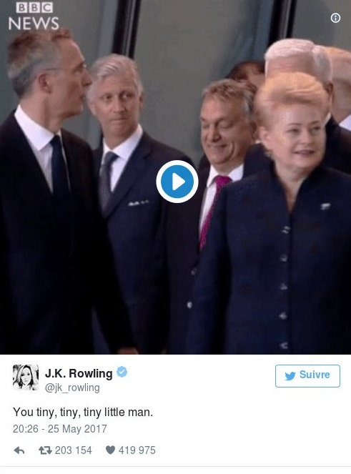 Χωρίς να ζητήσει συγγνώμη αλλά και χωρίς να κάνει μια γκριμάτσα ευγένειας ώθησε βίαια τον Μαυροβούνιο. Εκείνος εξεπλάγη δυσάρεστα, αλλά όταν αντίκρυσε τον αμερικανικό πρόεδρο χαμογέλασε στωικά και τον άφησε να περάσει, αδιαμαρτύρητα.