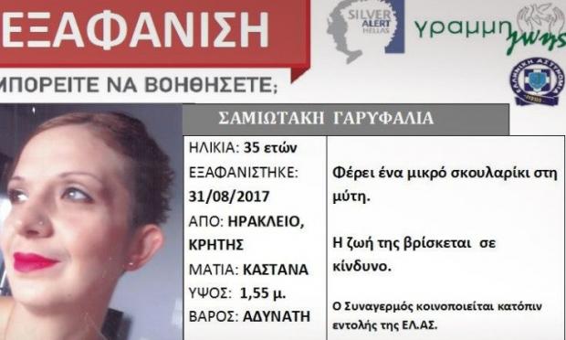 Έληξε με αίσιο τρόπο η αγωνία για την οικογένια της 35χρονης Γαρυφαλιάς Σαμιωτάκη, η οποία το βράδυ της 31ης Αυγούστου είχε εξαφανιστεί χωρίς να έχει δώσει σημεία ζωής για 11 ημέρες.