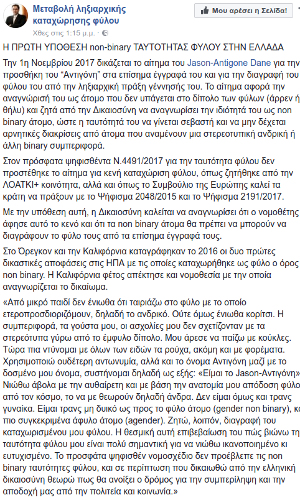 Όπως επισημαίνει, «με την υπόθεση αυτή, η Δικαιοσύνη καλείται να αναγνωρίσει ότι ο νομοθέτης άφησε αυτό το κενό και ότι τα non binary άτομα θα πρέπει να μπορούν να διαγράφουν το φύλο τους από τα επίσημα έγγραφά τους».