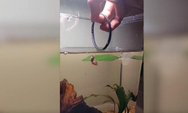 Το ψάρι που πρωταγωνιστεί στο βίντεο έχει εκπαιδευτεί να περνάει μέσα από τον κρίκο που τοποθετεί ο εκπαιδευτής του στην επιφάνεια του νερού. Κάνοντας ένα άκρως εντυπωσιακό άλμα, το ψάρι προσγειώνεται μέσα στο νερό.