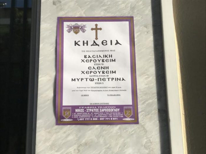Κανείς δεν είχε αντιληφθεί το παραμικρό. Χρειάστηκαν ώρες για να αποκαλυφθεί η τραγωδία. Φίλοι και συνάδελφοι αναζήτησαν τη σύζυγό του καθώς δεν είχε πάει στη δουλειά της… Όταν το μεσημέρι συγγενείς έφτασαν στο σπίτι αντίκρισαν το αποτρόπαιο έγκλημα. Και σήμερα το κηδειόχαρτο έχει μείνει για να θυμίζει τα όσα τραγικά έγιναν μέσα στο σπίτι της οικογένειας.
