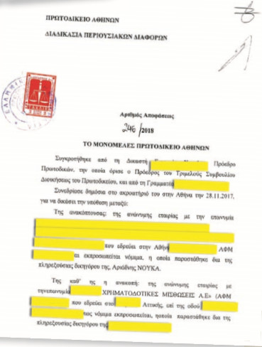 * Η λύση δόθηκε μέσω της δικαστικής οδού. Το Μονομελές Πρωτοδικείο Αθηνών ακύρωσε τον τίτλο εκτέλεσης και διέταξε την επαναφορά του ακινήτου στην κατασκευαστική. Συγκεκριμένα έκρινε πως η τελευταία δεν μπόρεσε να ανταποκριθεί στις υποχρεώσεις της διότι είχαν καταστεί ιδιαίτερα επαχθείς και το συμφωνηθέν αντάλλαγμα καταχρηστικά υπέρμετρο σε σχέση με την αντιπαροχή. Πρόσθετα, στην απόφαση του Πρωτοδικείου αναφέρεται πως ο χρηματοδοτικός φορέας, αν και είχε υποχρέωση ως πιστωτικό ίδρυμα με την κοινωνική, οικονομική και πολιτική σημασία που αυτό συνεπάγεται και υπαγόμενο σε υποχρεωτικούς κανόνες δεοντολογίας ως προς τη διευθέτηση καθυστέρησης των οφειλών αλλά και τους κανόνες της καλής πίστης και των χρηστών ηθών, δεν προέβη ούτε σε κατάλληλη λύση ρύθμισης ούτε σε κατάλληλη πρόταση οριστικής διευθέτησης και απέρριψε την πρόταση της εταιρίας χωρίς τεκμηρίωση και χωρίς να λαμβάνει υπόψη τις πραγματικές οικονομικές δυνατότητές της.