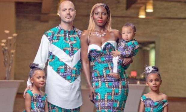 Ο Αμερικανός Τζάστιν ΜακΚλαρ,η σύζυγός του από τη Νιγηρία,Αμινάτ και τα τρία τους παιδιά, τις δίδυμες κόρες τους και το αγοράκι τους,ποζάρουν στο φακό με εντυπωσιακά ρούχα.