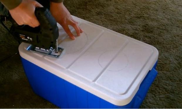 Με ένα τρυπάνι και ένα πριόνι (ή οποιαδήποτε άλλη μέθοδο σας δώσει το ίδιο αποτέλεσμα) ανοίξτε τις δύο τρύπες στο καπάκι.
