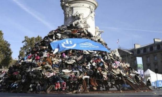 Μια πυραμίδα από παπούτσια στο Παρίσι κατά των βομβαρδισμών αμάχων σχημάτισε ΜΚΟ με σύνθημα «Ρίξτε παπούτσια, όχι βόμβες».