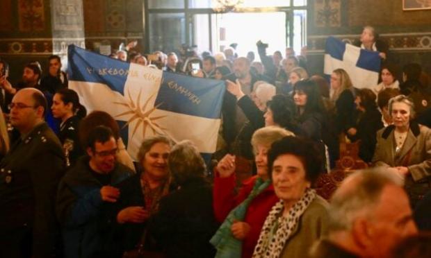 Μόλις τελείωσε ο Εθνικός μας Ύμνος, άρχισαν να ηχούν μέσα στην εκκλησία από τους πιστούς τα πρώτα τραγούδια για την Μακεδονία, με πρώτο το «Μακεδονία ξακουστή».