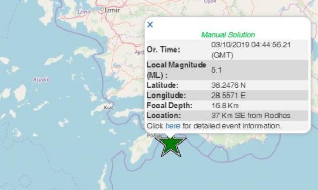 Σεισμός μεγέθους 5,1 βαθμών της Κλίμακας Ρίχτερ σημειώθηκε το πρωί της Πέμπτης νοτιανατολικά της Ρόδου.