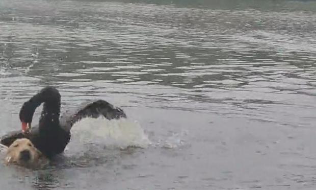 Στο Chengdu της Κίνας, ένα golden retriever, ενώ κολυμπάει σε μια λίμνη, δέχεται επίθεση από έναν μαύρο κύκνο...