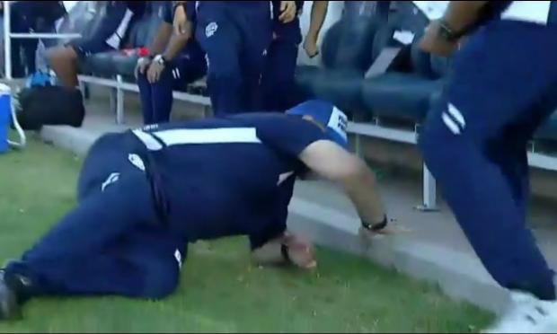 Βλέποντας την ομάδα του να χάνει καλή ευκαιρία για γκολ, ο Αργεντινός θρύλος δεν υπολόγισε καλά -πάνω στην αγανάκτηση του- και… έπεσε στο έδαφος! Μάλιστα, ο Μαραντόνα χρειάστηκε και τη βοήθεια δύο συνεργατών του, προκειμένου να σηκωθεί και να κάτσει στον πάγκο.