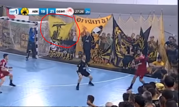 Oι σημαίες της Hezbollah και της Παλαιστίνης υψώθηκαν από τους φανατικούς της ΑΕΚ στο ματς που έδινε η ομάδα τους με τον Ολυμπιακό στους τελικούς της Α1 χάντμπολ.