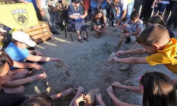 Σε μια λιτή και ταυτόχρονα συγκινητική εκδήλωση, η Ευαγελία Στραβαρίδη 102 ετών από τα Βουρλά της Μικράς Ασίας και ο Σταυρίκος Παπαβραμίδης 105 ετών από το Καρς του Πόντου, με την βοήθεια μικρών παιδιών, έριξαν χώμα από τις Αλησμόνητες Πατρίδες στα θεμέλια της Αγιάς Σοφιάς, του νέου γηπέδου της ΑΕΚ στη Νέα Φιλαδέλφεια.