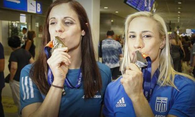 Οι δύο πρωταθλήτριες έφτασαν χαμογελαστές στο αεροδρόμιο Ελευθέριος Βενιζέλος και φορώντας τα μετάλλιά τους πόζαραν χαρούμενες στον φωτογραφικό φακό.