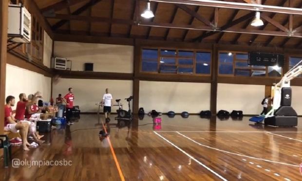 Ο αρχηγός του Ολυμπιακού έκανε διαγωνισμό με σουτ καθιστός από τον πάγκο, έχοντας αντίπαλο τον Αλέξανδρο Βεζένκοφ.