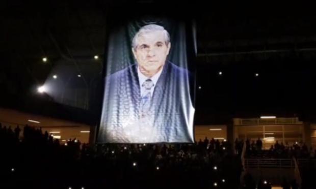 Σύσσωμη η “οικογένεια” του “τριφυλλιού” τίμησε τον ιστορικό ηγέτη των “πρασίνων” -που έφυγε πριν από λίγο καιρό- την ώρα που το λάβαρο του… σηκώθηκε στον “ουρανό” του κλειστού των Ολυμπιακών εγκαταστάσεων.