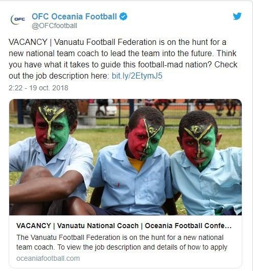 Η εθνική ομάδα του Βανουάτου (νότια του Ειρηνικού) έχει μείνει χωρίς προπονητή και, έσω του twitter, η Συνομοσπονδία της Ωκεανίας καλεί υποψήφιους να στείλουν τα βιογραφικά τους για να αναλάβουν το αντιπροσωπευτικό συγκρότημα!