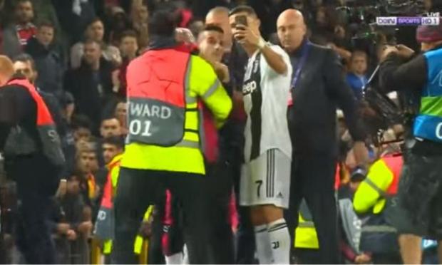 Κι αυτό γιατί, όταν οι δύο άντρες με κουκούλες εισέβαλαν στο γήπεδο, εκείνος όχι μόνο δεν τους αγνόησε, αφήνοντας τους άνδρες τις ασφάλειας να τους «κανονίσουν», αλλά πλησίασε τον έναν, του έσφιξε το χέρι, πήρε το κινητό του, χαμογέλασε πλατιά, και του χάρισε μια selfie που σίγουρα θα του μείνει αξέχαστη.