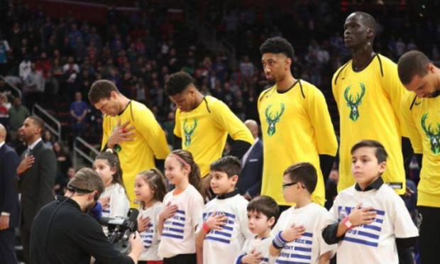 Μάλιστα, τις δύο ομάδες συνόδευσαν στο παρκέ μικρά παιδιά, τα οποία φορούσαν μπλουζάκια με την ελληνική σημαία, τα οποία είχαν επάνω τους και το σήμα των Πίστονς. Οι Μπακς, από την πλευρά τους, ανάρτησαν στο Twitter ένα μήνυμα στο οποίο κυριαρχεί η σημαία της χώρας μας και συνοδεύτηκε με το hashtag «Αυτός είναι ο λόγος που παίζουμε».