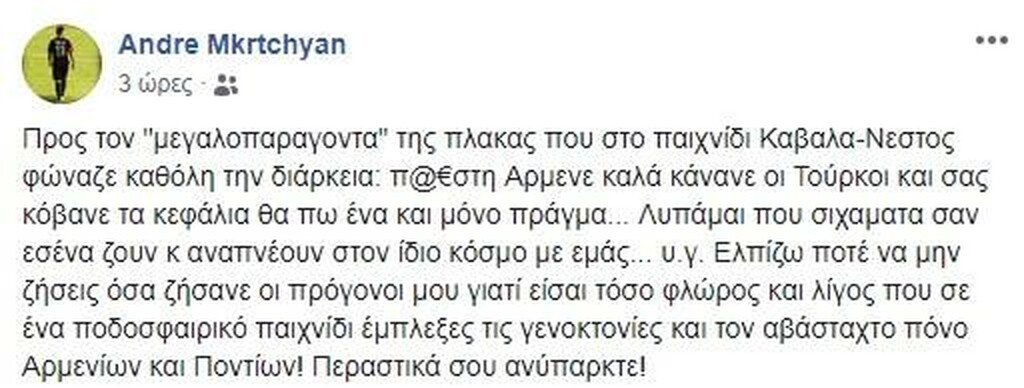 Ο έμπειρος στόπερ και αμυντικός χαφ, που έχει κάνει καριέρα σε ομάδες Β’ και Γ’ Εθνικής, μέσα από τη σελίδα του κατήγγειλε ρατσιστική και αντεθνική επίθεση από μεγαλοπαράγοντα της Καβάλας, στην οποία κι ο ίδιος έχει αγωνιστεί στο παρελθόν. Σύμφωνα με τον αρχηγό του Νέστου, παράγοντας της Καβάλας φώναζε την ώρα του αγώνα «που..η Αρμένιε, καλά κάνανε οι Τούρκοι και σας κόβανε τα κεφάλια»…