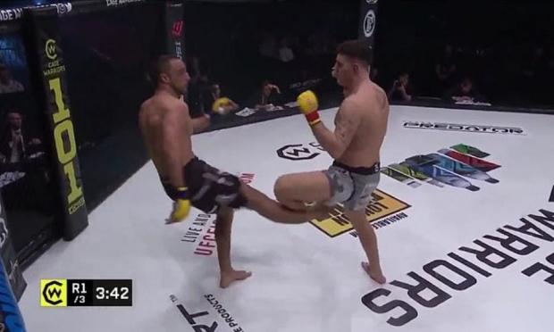Μετά το χτύπημα ο Boukichou φαίνεται να πέφτει στο πάτωμα σφαδάζοντας από τους πόνους με τον διαιτητή να διακόπτει το παιχνίδι για το Cage Warriors 101 που διεξήχθη το βράδυ του Σαββάτου.