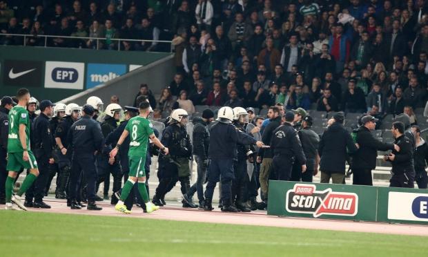 Νωρίτερα το ντέρμπι διακόπηκε προσωρινά στο πέμπτο λεπτό, μετά από επίθεση οπαδών του "τριφυλλιού" στον πάγκο του Ολυμπιακού. «Είχαν μαχαίρι οι οπαδοί που έκαναν ντου», κατήγγειλαν οι Πειραιώτες.