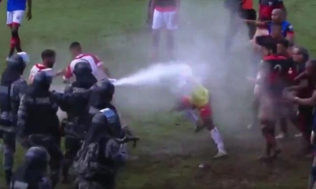 Οι κλοτσιές και οι μπουνιές έπεσαν… σύννεφο, με την αστυνομία να αναγκάζεται να επέμβει για να σταματήσει τις «μάχες» των ποδοσφαιριστών και να κάνει τα πράγματα μάλλον χειρότερα, αφού έριξε και σπρέι πιπεριού μέσα στον αγωνιστικό χώρο κατά… δικαίων και αδίκων.