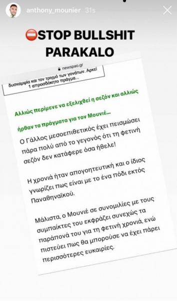Ο Μουνιέ με ανάρτησή του στο Instagram απάντησε σε όλα τα σενάρια περί αποχώρησης του και το έκανε με ιδιαίτερα σκληρό τρόπο. Ο παίκτης του τριφυλλιού ανέβασε ένα screenshot κι έγραψε: «Σταματήστε τις μ@λ@κίες, παρακαλώ!».