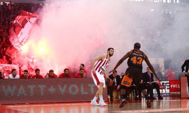 Κι αυτό γιατί κατά τη διάρκεια του τρίτου δεκαλέπτου και με τον Ολυμπιακό να έχει μεγάλο προβάδισμα στο ματς, οι οπαδοί άναψαν καπνογόνα στην κερκίδα, κάνοντας αποπνικτυκή την ατμόσφαιρα. Έτσι οι διαιτητές διέκοψαν προσωρινά το παιχνίδι, στέλνοντας τις δύο ομάδες στον πάγκο. Στη συνέχεια πάντως και αφού «καθάρισε» το γήπεδο από τους καπνούς μετά από λίγα λεπτά, το ματς συνεχίστηκε.