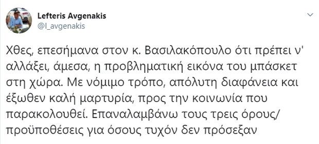 Συγκεκριμένα, ο Υφυπουργός Αθλητισμού έγραψε στα social media: "Χθες, επεσήμανα στον κ. Βασιλακόπουλο ότι πρέπει ν' αλλάξει, άμεσα, η προβληματική εικόνα του μπάσκετ στη χώρα. Με νόμιμο τρόπο, απόλυτη διαφάνεια και έξωθεν καλή μαρτυρία, προς την κοινωνία που παρακολουθεί. Επαναλαμβάνω τους τρεις όρους/προϋποθέσεις για όσους τυχόν δεν πρόσεξαν".