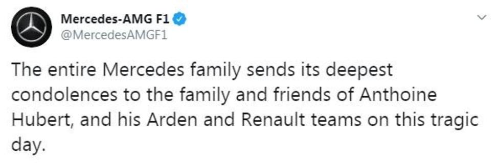 Η FIA το απόγευμα του Σαββάτου με επίσημη ανακοίνωσή της ενημέρωσε πως ο Γάλλος Antoine Hubert, βρήκε τραγικό θάνατο, την στιγμή που ο uan Manuel Correa νοσηλεύεται σε σταθερή κατάσταση στο νοσοκομείο.