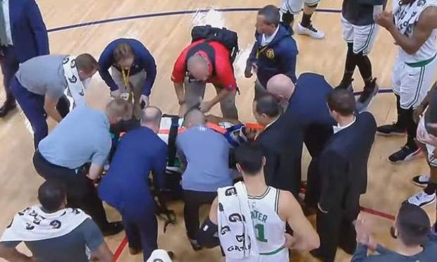 Αμέσως μπήκαν μέσα οι άνθρωποι των Σέλτικς, με τον άσο της ομάδας να αποχωρεί από το γήπεδο με φορείο, ενώ του φορέθηκε και κολάρο με συμπαίκτες και αντιπάλους να κοιτούν σαστισμένοι.