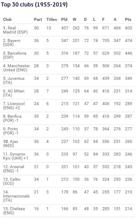 Αξίζει να σημειωθεί ότι και ο Παναθηναϊκός βρίσκεται στο Νο28 με 143 πόντους, 49 νίκες, 45 ισοπαλίες και 63 ήττες.