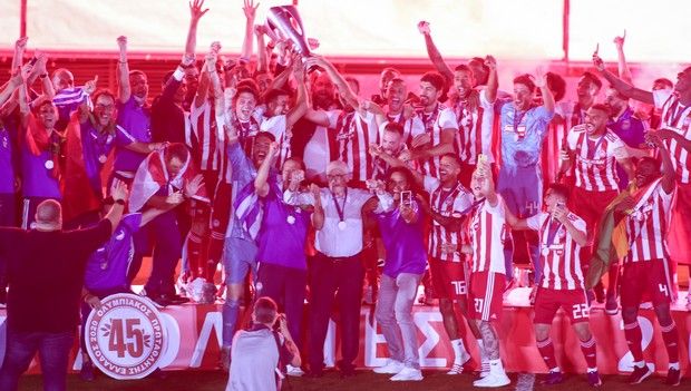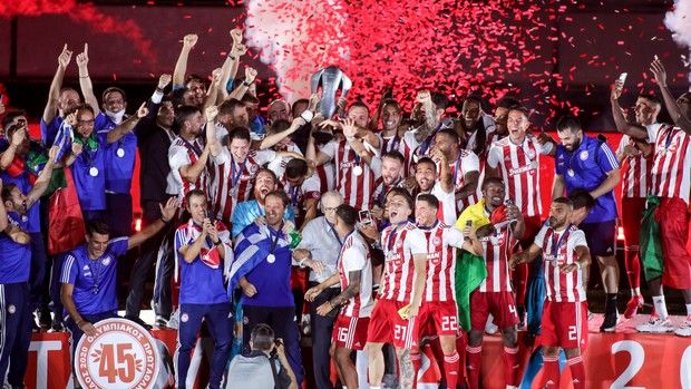 Στον ουρανό του Πειραιά «υψώθηκε» το 45ο τρόπαιο του πρωταθλητή Ελλάδας Ολυμπιακού, κατά τη διάρκεια μίας διαφορετικής φιέστας, ελέω κορονοϊού.