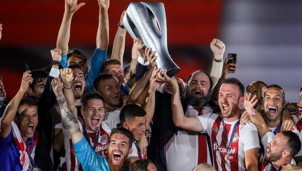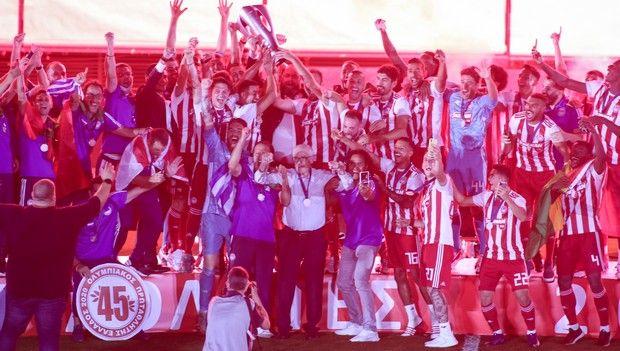 Ο ιδιοκτήτης της ΠΑΕ, Βαγγέλης Μαρινάκης, παρέλαβε το βαρύτιμο τρόπαιο από τα χέρια της αναπληρώτριας προέδρου της Λίγκας, Κάτιας Κοξένογλου, και το σήκωσε πρώτος στον αέρα, πανηγυρίζοντας στη συνέχεια μαζί με την υπόλοιπη ομάδα και αφιερώνοντας τον εφετινό τίτλο στον επίτιμο πρόεδρο των «ερυθρόλευκων», Σάββα Θεοδωρίδη.