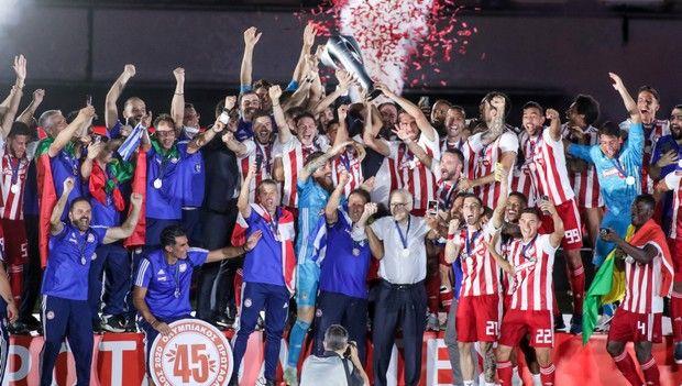 Μετά το επιβλητικό 3-0 επί της ΑΕΚ στο άδειο στάδιο «Γ. Καραϊσκάκης» και αφού είχαν προηγηθεί οι αναμενόμενοι πανηγυρισμοί εντός των αποδυτηρίων, οι «ερυθρόλευκοι» ανέβηκαν μετά από δύο χρόνια και πάλι στο βάθρο του πρωταθλητή, που στήθηκε στο κέντρο του γηπέδου.