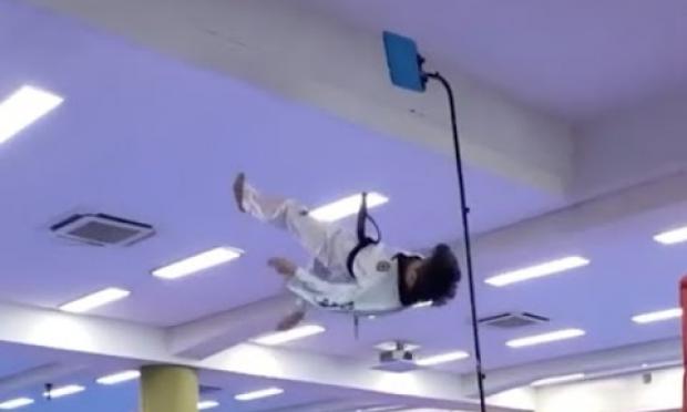 Στη Νότια Κορέα, ένας μαχητής Taekwondo εκτελεί ένα ανάποδο πήδημα (backflip) που ακολουθείται από μια κλωτσιά σε έναν ξύλινο πίνακα που βρίσκεται αρκετά μέτρα πάνω από το έδαφος... Εντυπωσιακό!