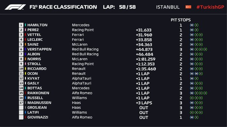 Ιστορικό το Grand Prix στην Κωνσταντινούπολη. Ο Λιούις Χάμιλτον ήταν ο μεγάλος νικητής εξασφαλίζοντας μαθηματικά την κατάκτηση του τίτλου με τρεις αγώνες να απομένουν στο καλεντάρι και ισοφαρίζοντας την επίδοση-ρεκόρ των επτά τίτλων του Μίχαελ Σουμάχερ.