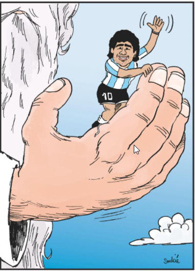 Τώρα λοιπόν η Equipe φιλοξενεί σκίτσο με το χέρι του Θεού να παίρνει μαζί του το…”χέρι του Θεού”, δηλαδή τον Ντιέγκο Μαραντόνα.