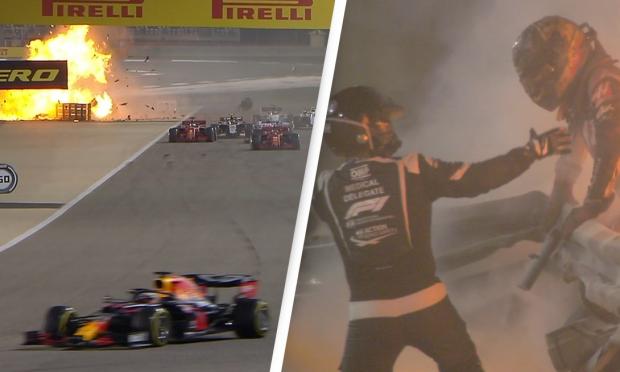 οποίο στη συνέχεια τυλίχθηκε στις φλόγες και προσέκρουσε με σφοδρότητα στις προστατευτικές μπάρες. Ευτυχώς ο Γάλλος οδηγός της Haas βγήκε μέσα από τις φλόγες και υποβασταζόμενος μεταφέρθηκε στο ασθενοφόρο. Όπως ήταν φυσικό ο αγώνας διεκόπη. Το μονοθέσιο του διαλύθηκε ολοσχερώς και όπως θα δείτε στις εικόνες, ο Γκροζάν σώθηκε από θαύμα.