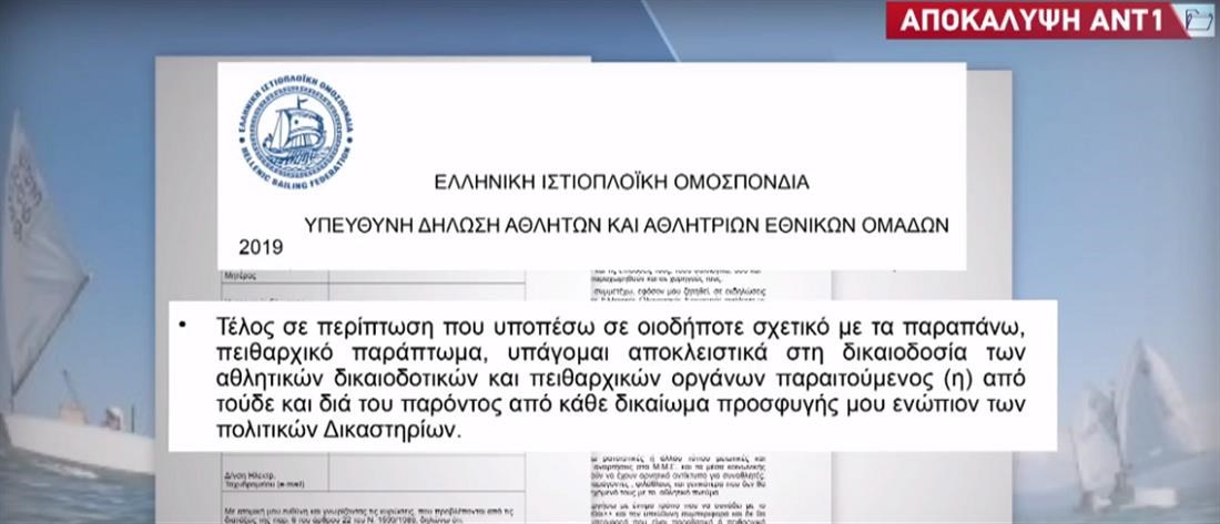 Δεμένους "χειροπόδαρα" είχε η Ελληνική Ιστιοπλοϊκή Ομοσπονδία τους αθλητές που ήθελαν να ενταχθούν στην Εθνική Ομάδα, καθώς τους έβαζε να υπογράφουν υπεύθυνη δήλωση, με την οποία παραιτούνταν του δικαιώματος, να προσφύγουν στα δικαστήρια.