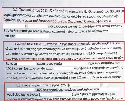 Επίσης, για μέλος του ΔΣ της ίδιας Ομοσπονδίας αναφέρεται ότι «το 2012 έλαβε από το ταμείο της ΕΙΟ το ποσό των 30.000 ευρώ με σκοπό να μεταβεί στο Λονδίνο και να καλύψει τα έξοδα της ολυμπιακής ομάδας. Πλην όμως ουδέποτε συνόδευσε την ολυμπιακή ομάδα, ενώ ένας συνεργάτης του (σ.σ. από τους πρωταγωνιστές των πρόσφατων αποκαλύψεων) μονολογούσε φωναχτά «εγώ φέρνω τα λεφτά από τη Γενική Γραμματεία Αθλητισμού για τους αθλητές και αυτοί οι δύο τα τρώνε», υπονοώντας άλλους σημαντικούς παράγοντες της Ομοσπονδίας».
