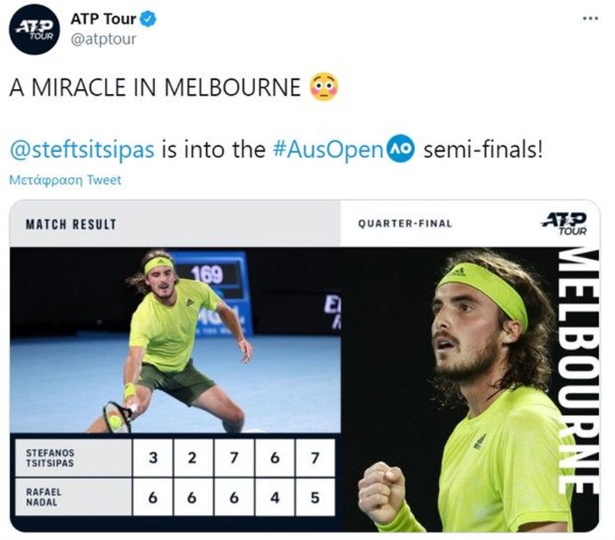 Μετά από έναν συγκλονιστικό αγώνα τεσσάρων ωρών και πέντε λεπτών, ο Στέφανος Τσιτσιπάς πέτυχε πιθανότατα την μεγαλύτερη μέχρι στιγμής πρόκριση της καριέρας του, αφού επικράτησε του Ραφαέλ Ναδάλ με 3-2 σετ και προκρίθηκε στα ημιτελικά του Australian Open!