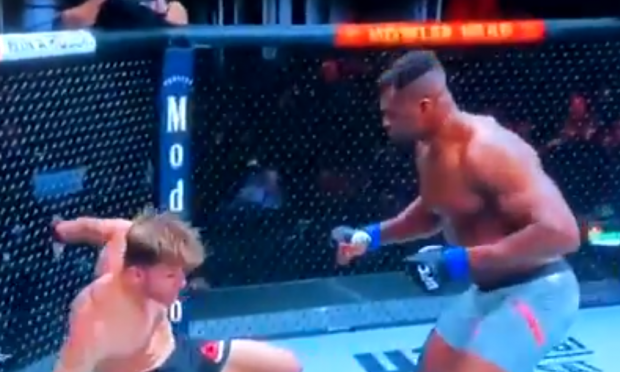 Στον δεύτερο γύρο της αναμέτρησης για το UFC 260 στο Λας Βέγκας, ο Νγκάνου έστειλε με το αριστερό άπερκατ τον Μίοσιτς επάνω στα σύρματα του κλουβιού.