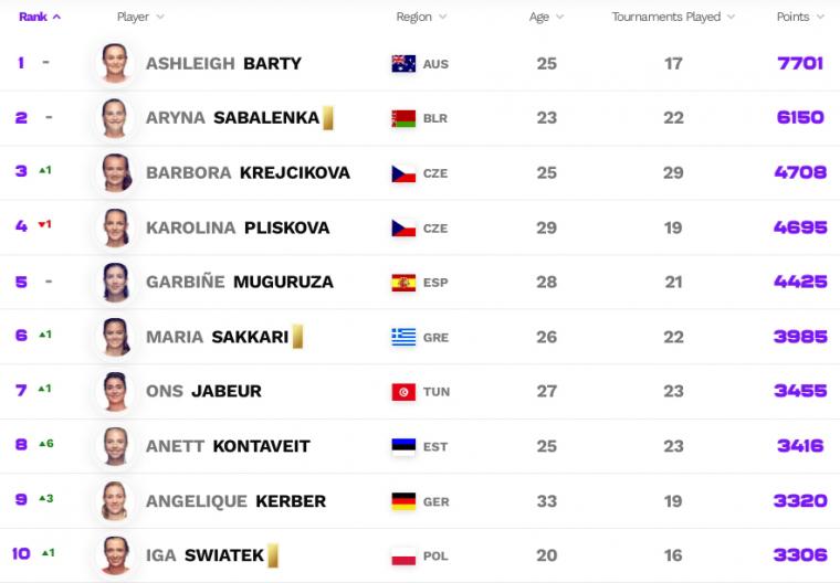 Η Σπαρτιάτισσα προσπέρασε στην κατάταξη την Ελίνα Σβιτολίνα και έχει πλέον από πάνω της μόνο τις Μπάρτι, Σαμπαλένκα, Κρεϊτσίκοβα, Πλίσκοβα και Μουγκουρούθα, με την τελευταία μάλιστα να βρίσκεται σε… απόσταση βολής.
