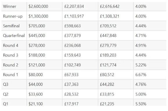 Ο νικητής σε άνδρες και γυναίκες θα εισπράξει το ποσό των 2,6 εκατ. ευρώ και ο φιναλίστ θα πάρει 1,3 εκατ. Ο ημιφιναλίστ θα βάλει στην τσέπη του το ποσό των 705.000 δολαρίων ενώ η πρόκριση στους "8" δίνει 445.000 δολάρια.