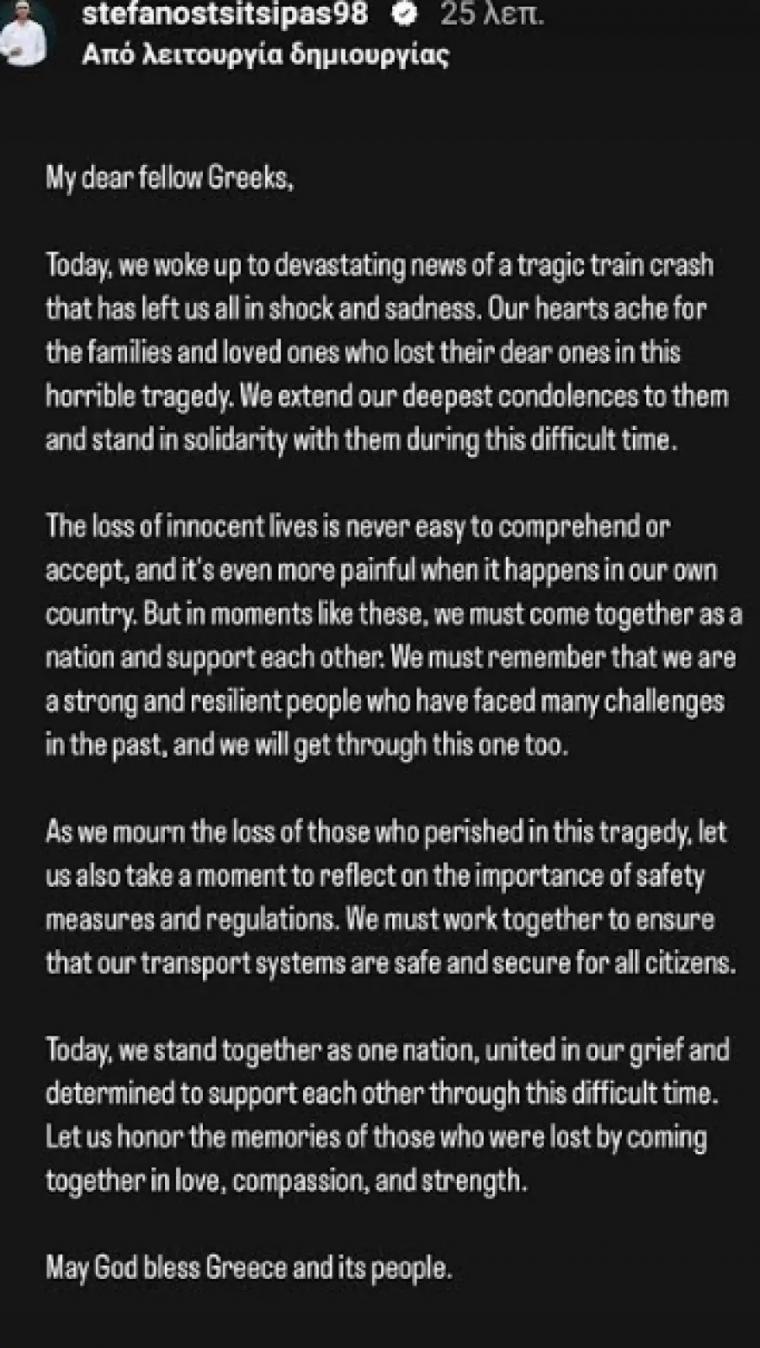 «Αγαπημένοι μου Έλληνες ακόλουθοι, σήμερα ξυπνήσαμε με τα τραγικά νέα για τη σύγκρουση των τρένων που μας άφησε όλους σοκαρισμένους και στεναχωρημένους. Η καρδιά μας πονάει για τις οικογένειες που έχασαν τα αγαπημένα τους πρόσωπα σε αυτή τη φρικτή τραγωδία. Στέλνουμε τα ειλικρινή μας συλλυπητήρια σε αυτούς και στεκόμαστε στο πλευρό τους σε αυτές τις δύσκολες στιγμές.