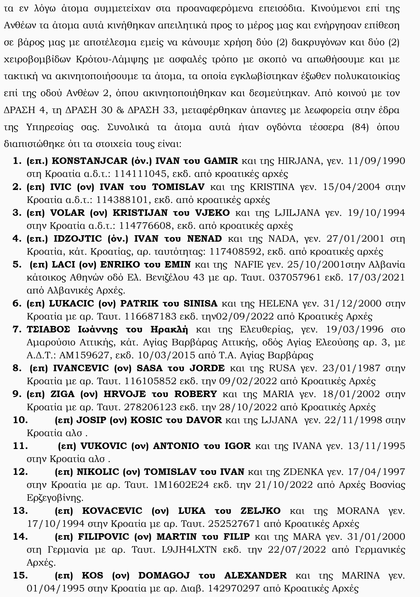 Ανακριτικό Υπάλληλο ΥΠΟΔΕΙΓΜΑ Δ-5 Υπόδειγμα «Έκθεση ένορκης εξέτασης μάρτυρα (Κ.Π.Δ.)» τα εν λόγω άτομα συμμετείχαν στα προαναφερόμενα επεισόδια. Κινούμενοι επί της Ανθέων τα άτομα αυτά κινήθηκαν απειλητικά προς το μέρος μας και ενήργησαν επίθεση σε βάρος μας με αποτέλεσμα εμείς να κάνουμε χρήση δύο (2) δακρυγόνων και δύο (2) χειροβομβίδων Κρότου-Λάμψης με ασφαλές τρόπο με σκοπό να απωθήσουμε και με τακτική να ακινητοποιήσουμε τα άτομα, τα οποία εγκλωβίστηκαν έξωθεν πολυκατοικίας επί της οδού Ανθέων 2, όπου ακινητοποιήθηκαν και δεσμεύτηκαν. Από κοινού με τον ΔΡΑΣΗ 4, τη ΔΡΑΣΗ 30 & ΔΡΑΣΗ 33, μεταφέρθηκαν άπαντες με λεωφορεία στην έδρα της Υπηρεσίας σας».