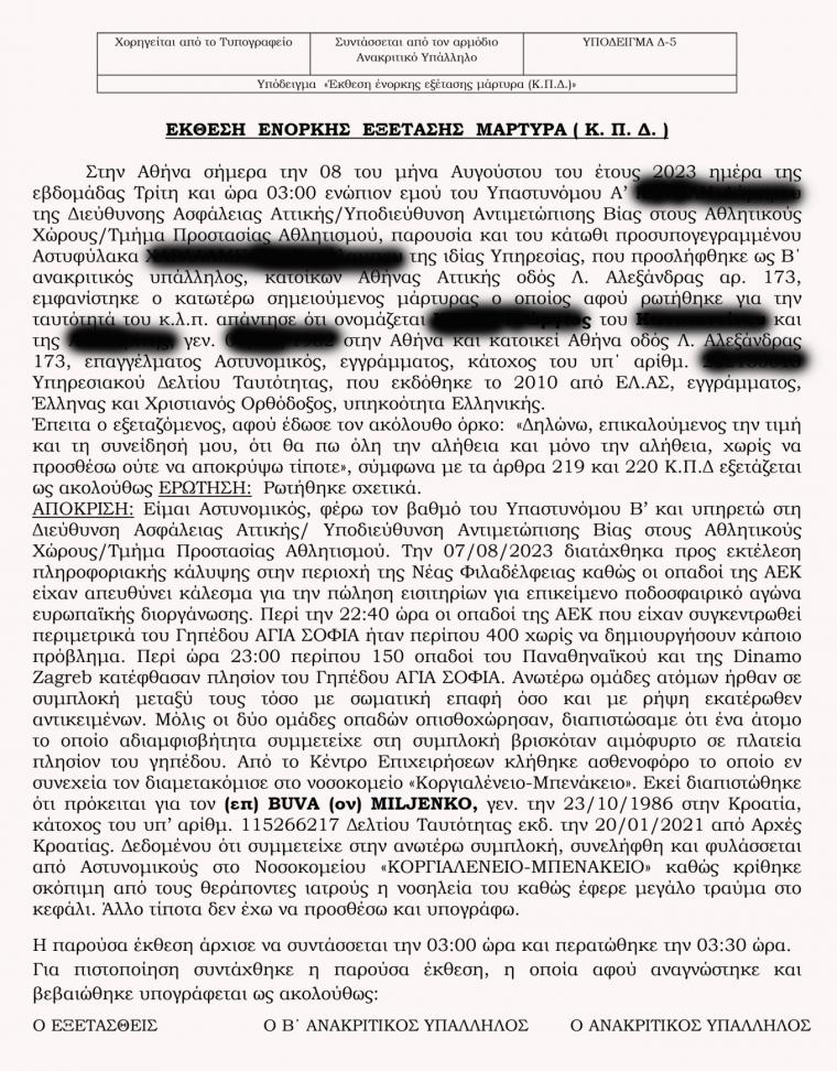 «Είμαι αστυνομικός, φέρω το βαθμό του Ειδικού Φρουρού. Την 07/08/2023 διαταχθήκαμε προς εκτέλεση υπηρεσίας στην ευρύτερη περιοχή των Πατησίων κατά το ωράριο 20:00 έως 02:00 της επόμενης ημέρας. Περί ώρα 23:25 της 07/08/2023 λάβαμε εντολή από το Κέντρο Ασφαλείας, να ενσωματωθούμε με την ΟΠΚΕ Κ-223, επί της οδού Ανθέων για εντοπίσουμε στα πέριξ στενά, άτομα – οπαδούς οι οποίοι συμμετείχαν σε επεισόδια που έλαβαν χώρα σε προγενέστερο χρόνο εξωτερικά του γηπέδου ΟΠΑΠ ΑΡΕΝΑ στη Φιλαδέλφεια Αττικής. Κατά την περιπολία μας στο ανωτέρω σημείο και συγκεκριμένα στην συμβολή των οδών Προμπονά και Αριοβαρζανού, εντοπίσαμε περί τα 150 άτομα με σκουρόχρωμα ρούχα και καλυμμένα χαρακτηριστικά του πρόσωπου τους με κουκούλες και καπέλα, τα οποία στη θέα μας κατευθύνθηκαν επί της οδού Αριοβαρζανού.