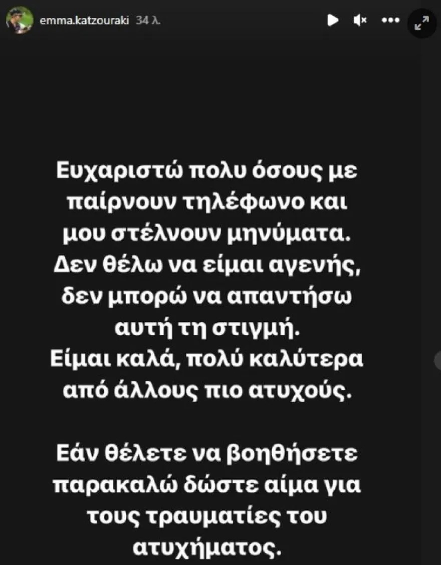 Η Εμμανουέλα μετά από την σύγκρουση στα Τέμπη είχε πει στο protothema.gr: «Δεν θέλω να πω πολλά μόνο ότι είμαι καλά. Ένα διάστρεμμα έπαθα και τίποτε άλλο».